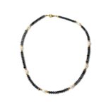 Ένα statement τσόκερ από φυσικό αιματίτη, χειροποίητα δεμένο σε πολλαπλές σειρές, που καταλήγουν σε έναν πολυτελή κεντρικό λίθο με βασιλική αύρα.